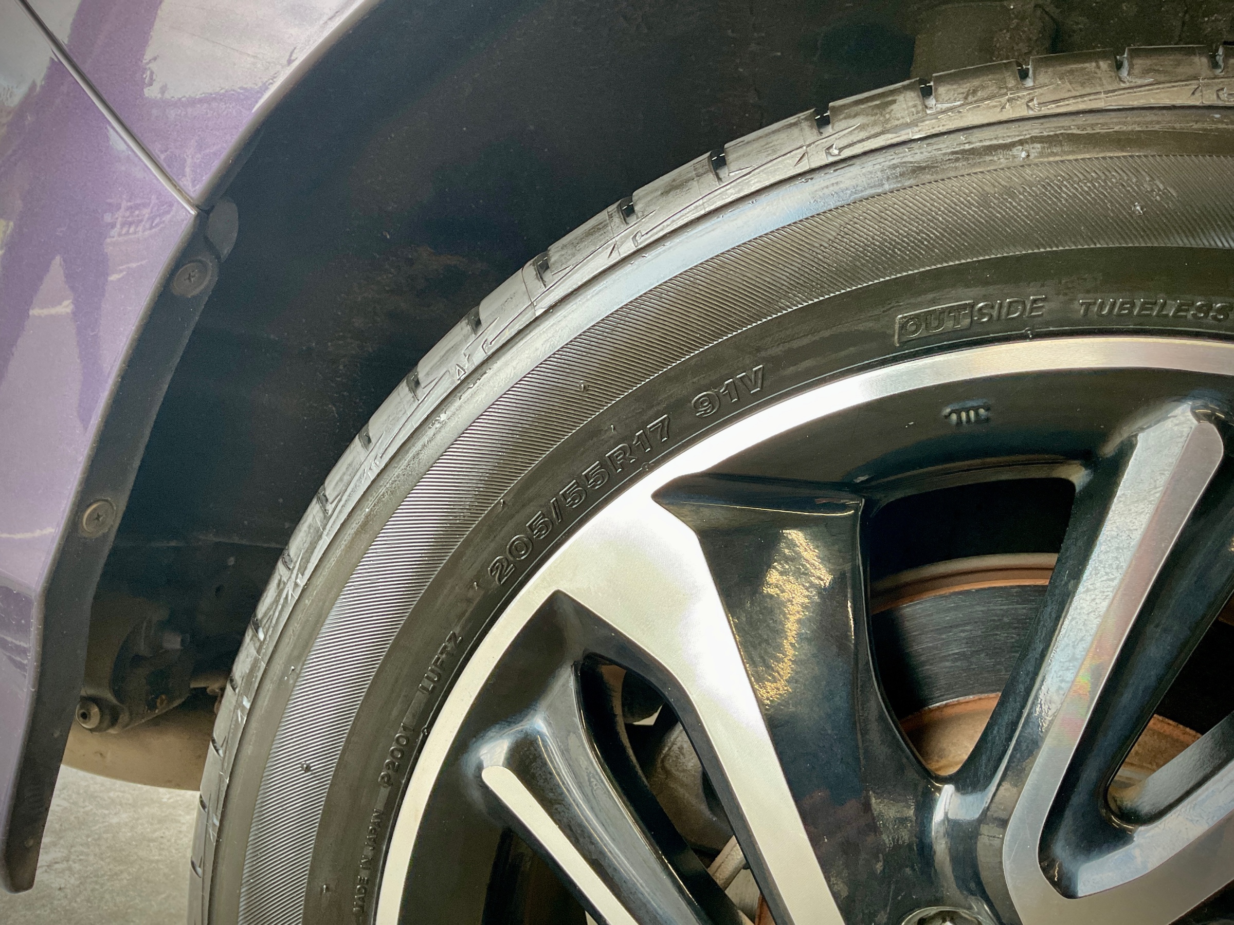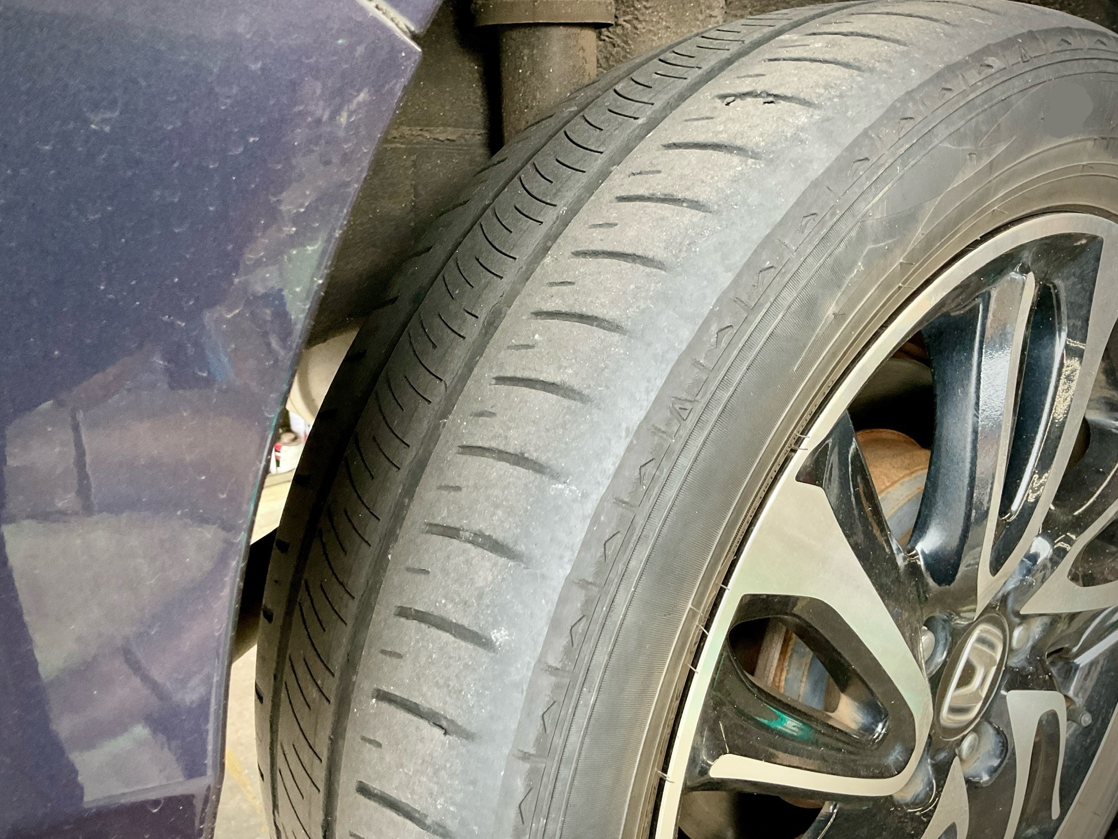 交換前のタイヤ、ショルダー(設置面と側面の境界あたり)部分の摩耗が進んでいるのがわかりますでしょうか。