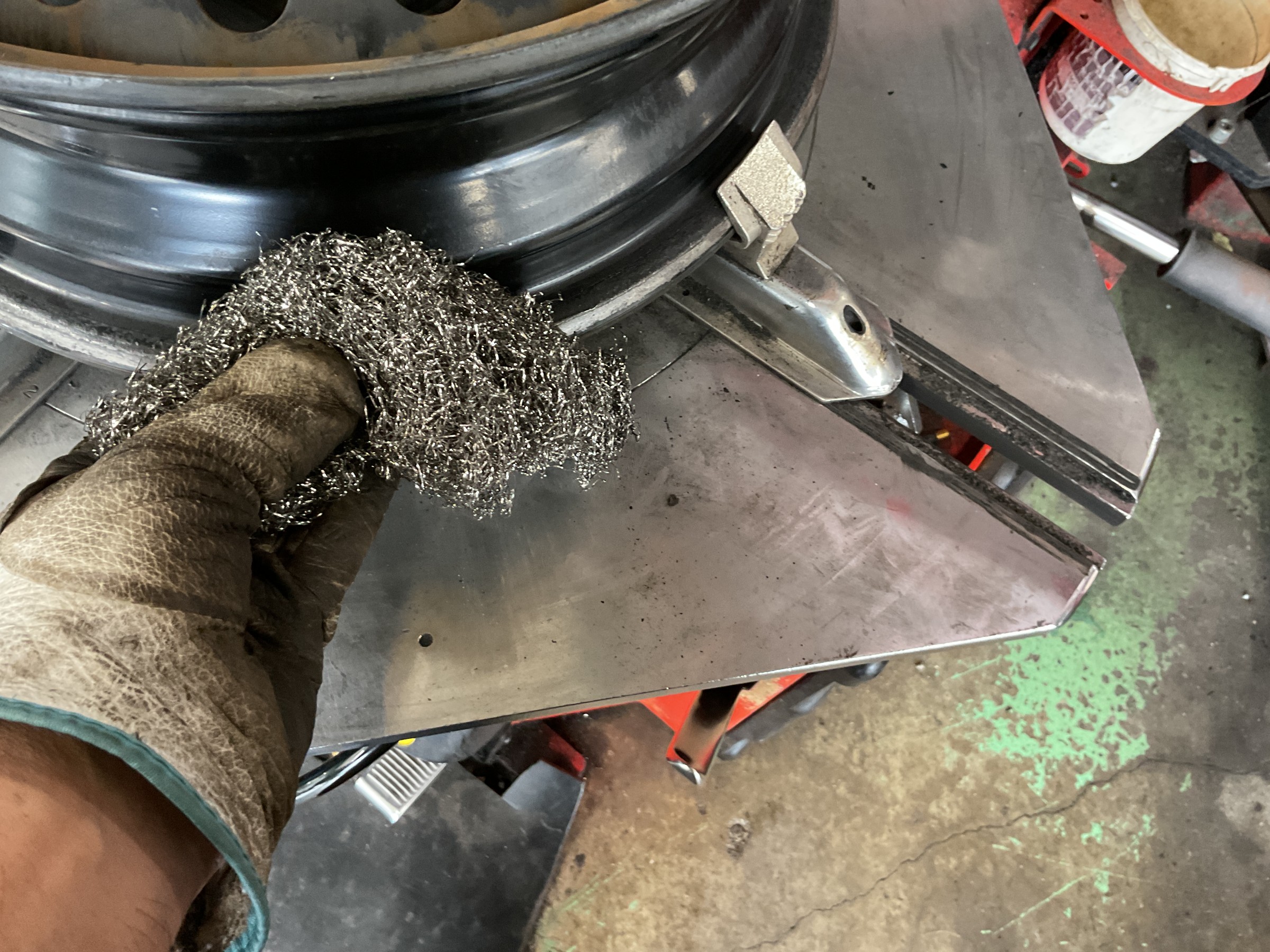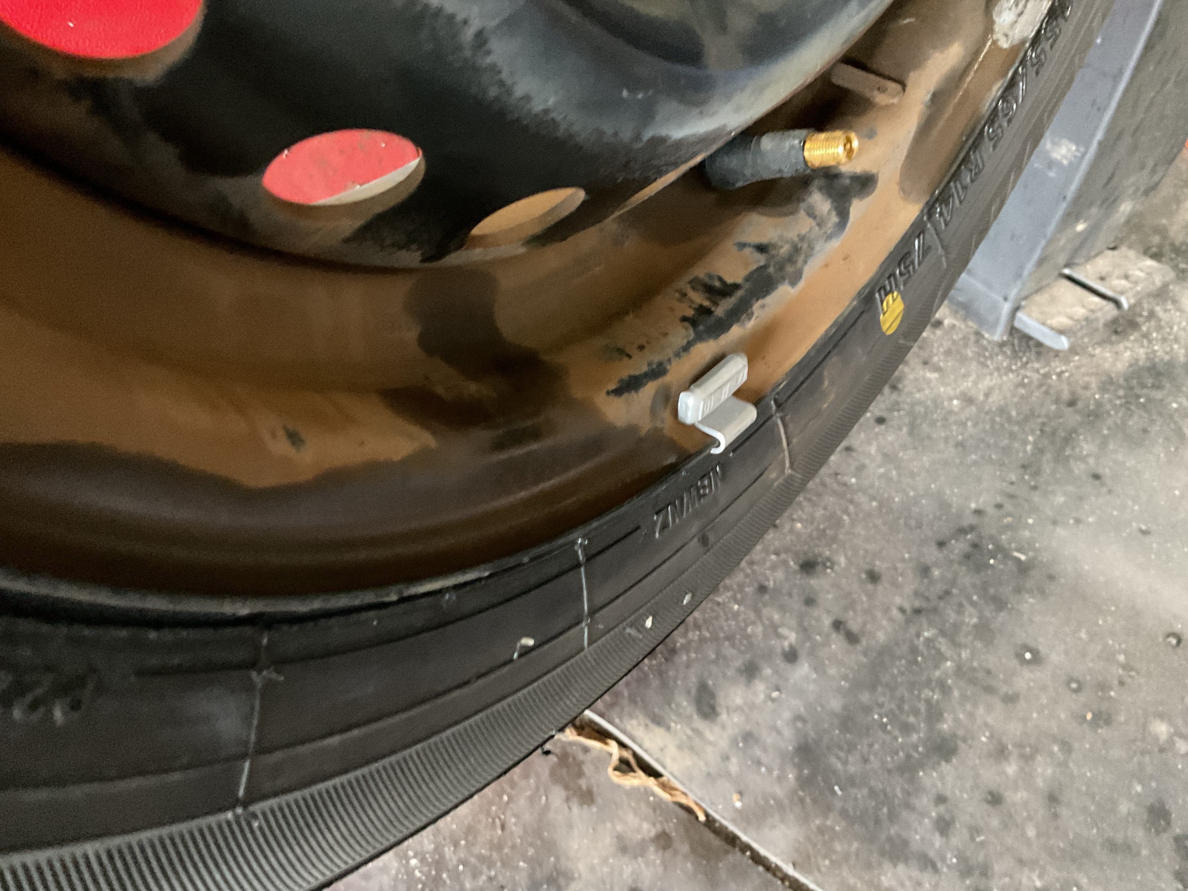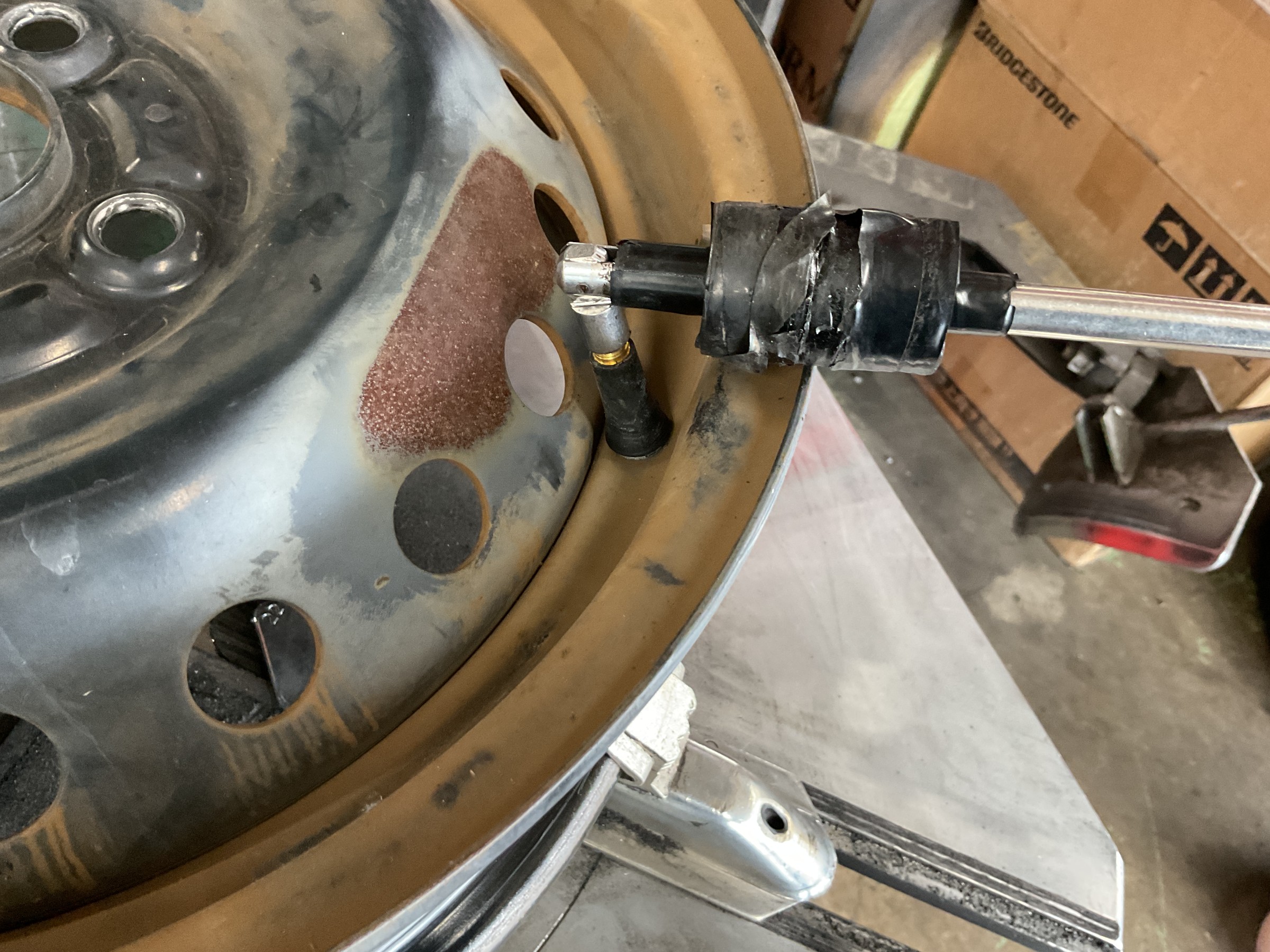 古いゴムバルブを切り取り、リムを掃除後新しいゴムバルブに交換し、タイヤを組み込みます。