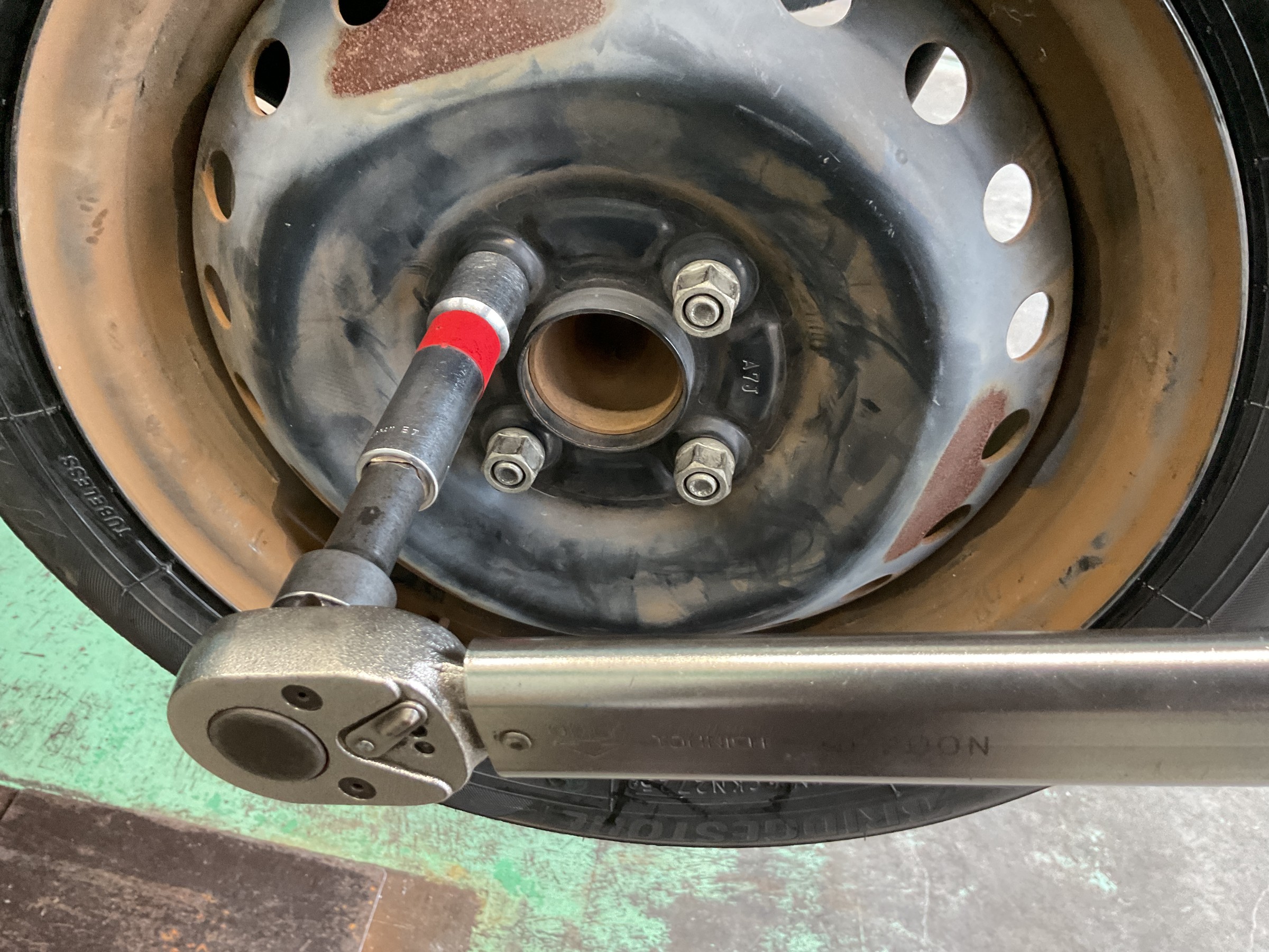 内圧を規定値に合わせて車両に取り付け、トルクレンチでナットを規定トルクで締め付けたら完成です。