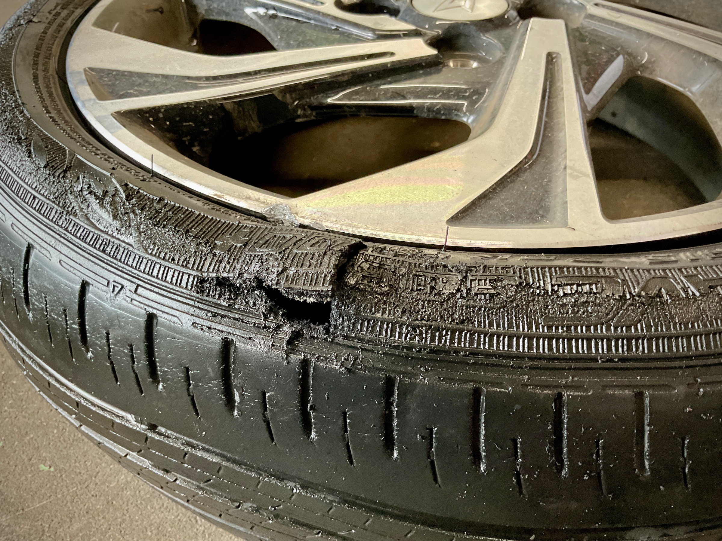 タイヤの側面が接触により破けてしまっております。
