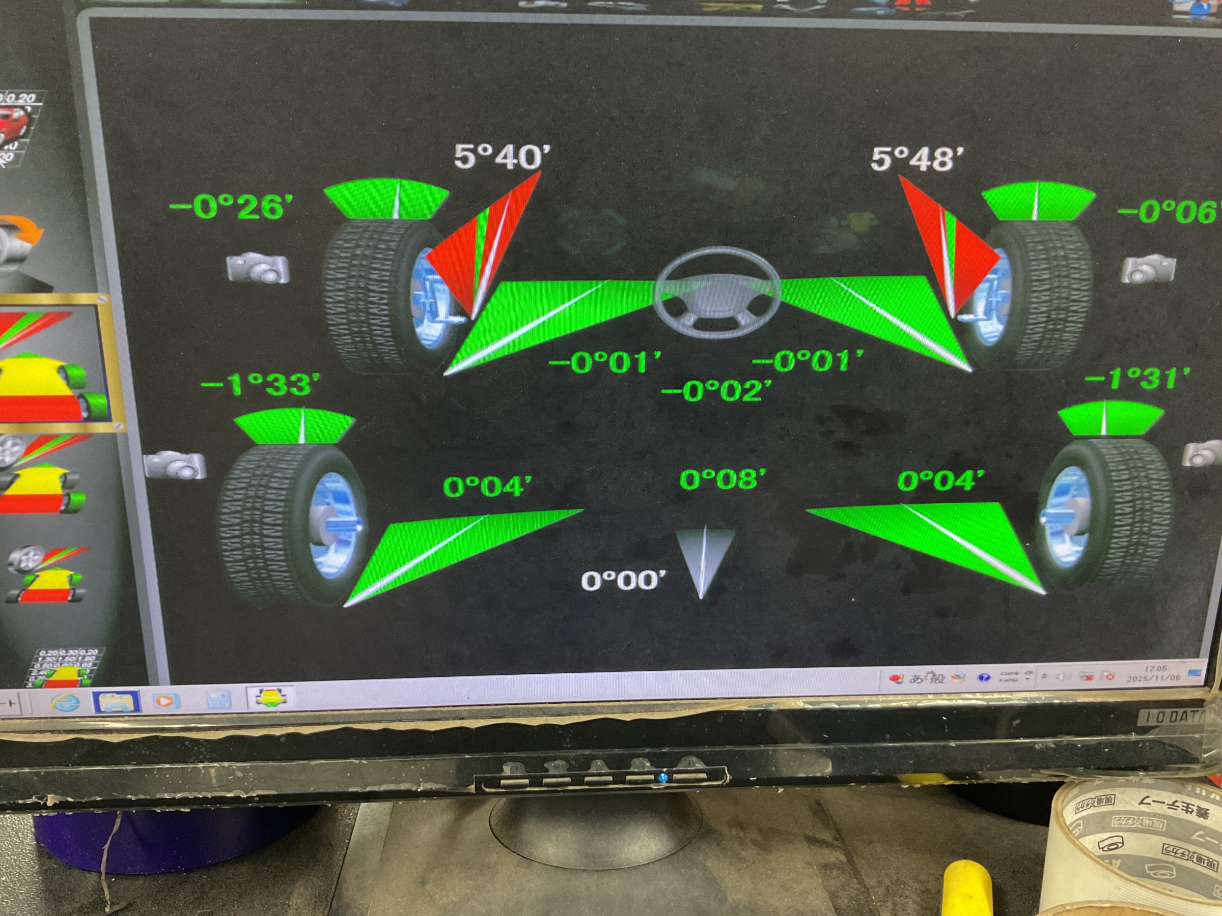 新品のタイヤを装着したら、アライメント測定に移ります。