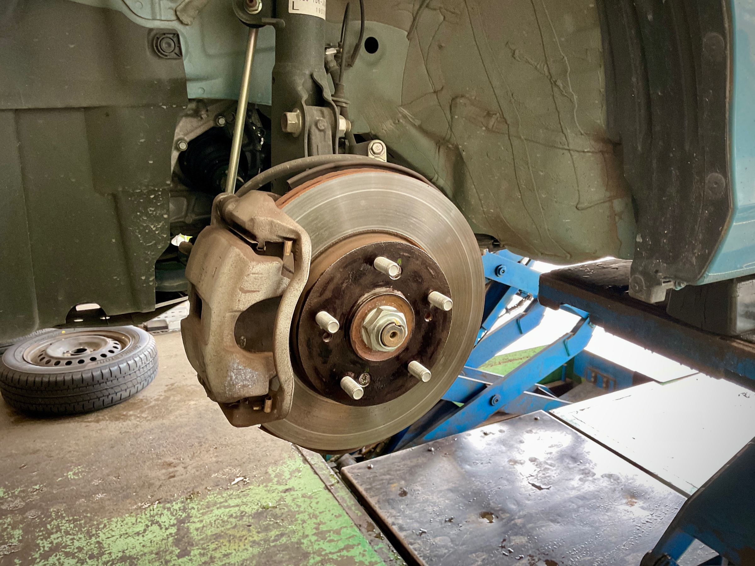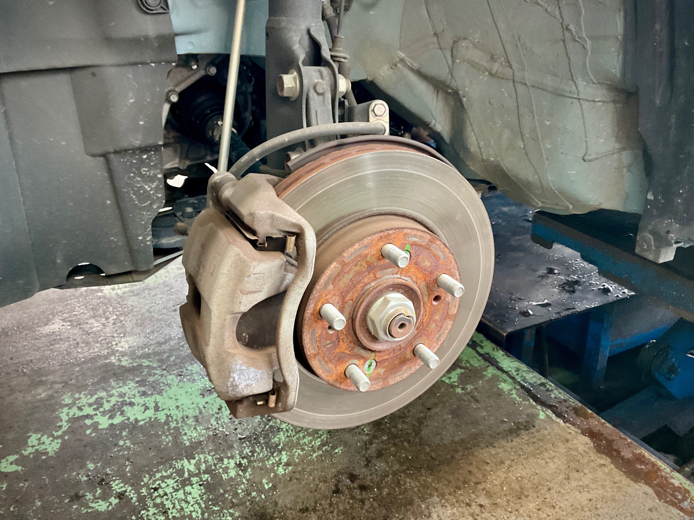 タイヤホイールを外してみるとハブ面やハブボルトに赤サビが発生していますね。