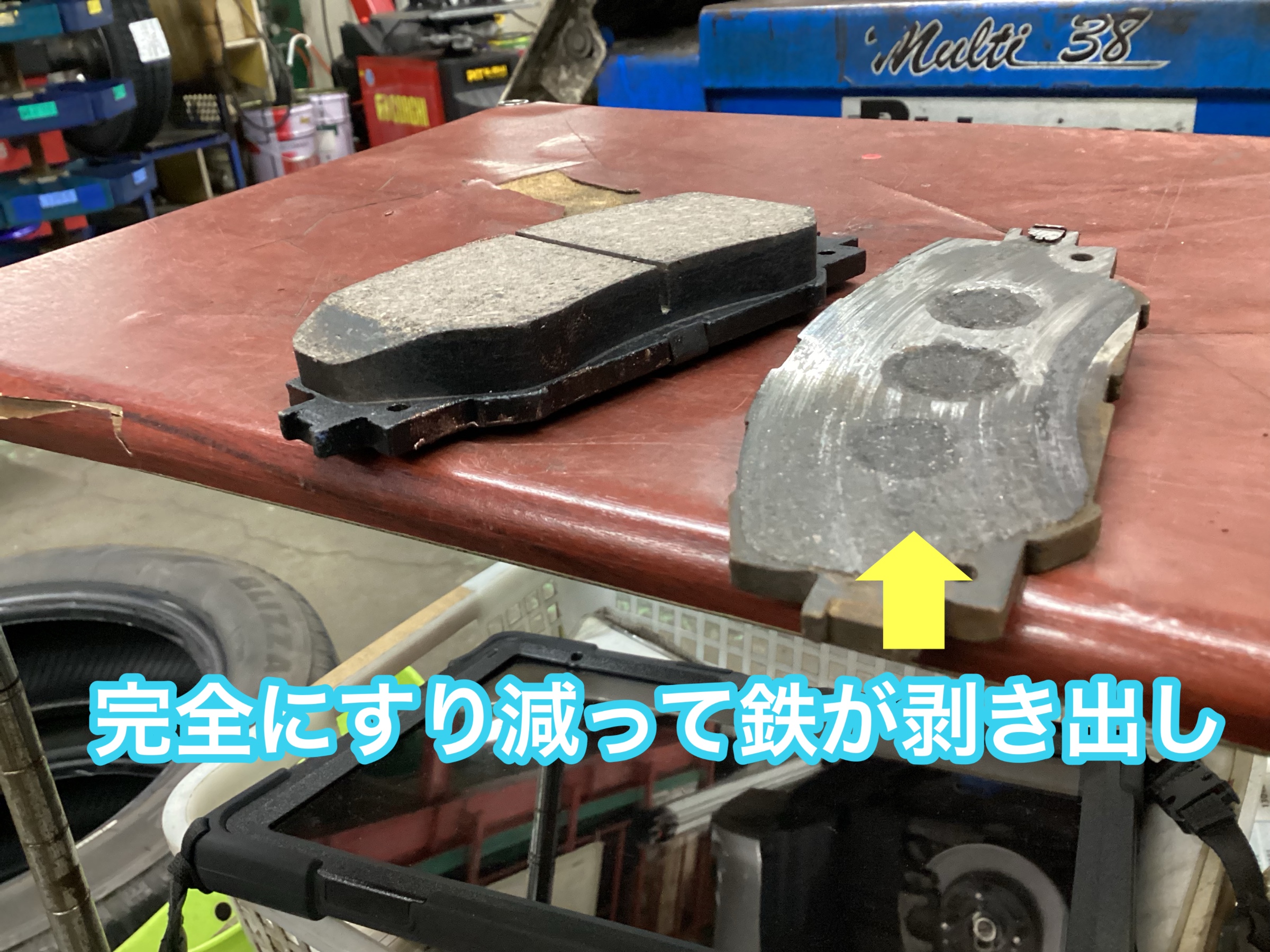 ブレーキパッドはローター側(円盤)を挟み込んで止めています、ブレーキパッドが消耗限度を