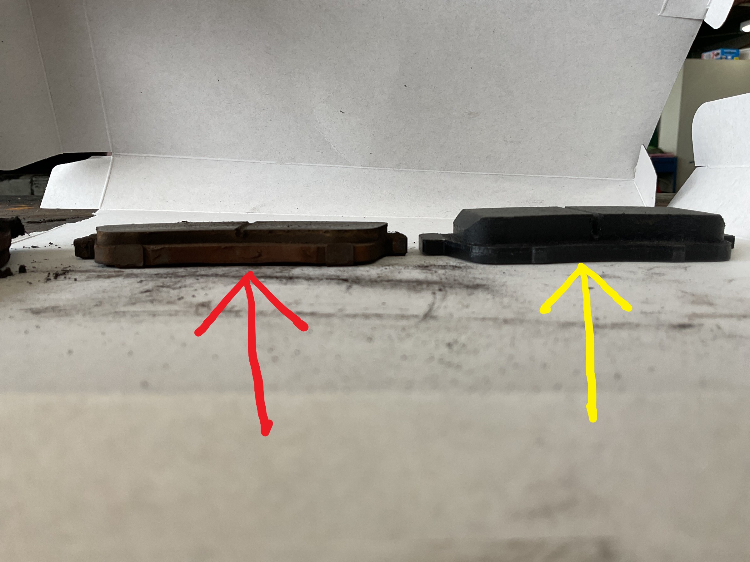 左の赤矢印側が外したブレーキパッドで、黄色矢印側が新品ブレーキパッド!