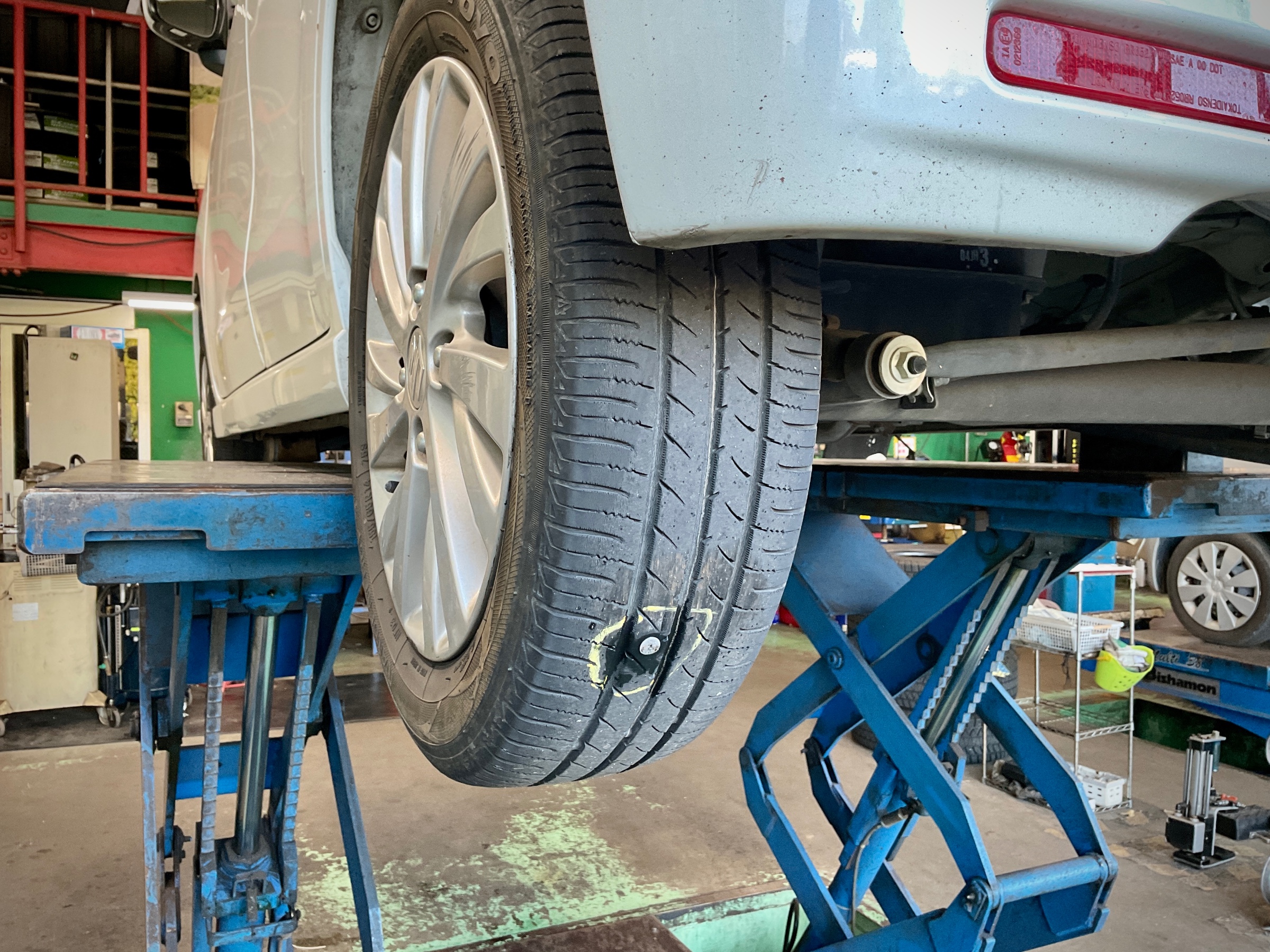 左後ろのタイヤにネジが刺さってしまっていました。