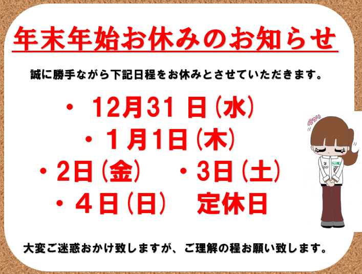 年末年始休業のお知らせ ポスト 2025年12月28日 タイヤ館八千代店をご利用頂き誠にありがとうございます。 12月31日(水)・1月1日(木)・2日(金)・3日(土)・4日(日) 上記の日程は定休日となります。 ご利用のお客様に置かれましてはご迷惑おかけいたしますが、 何卒ご理解ご了承の程お願い申し上げます。 タイヤ館 八千代 住所:276-0046千葉県八千代市大和田新田988-6 電話番号: 047-458-1777 相談予約 タイヤ点検・安全点検/タイヤ履き替え/オイル交換/その他ピット作業の予約