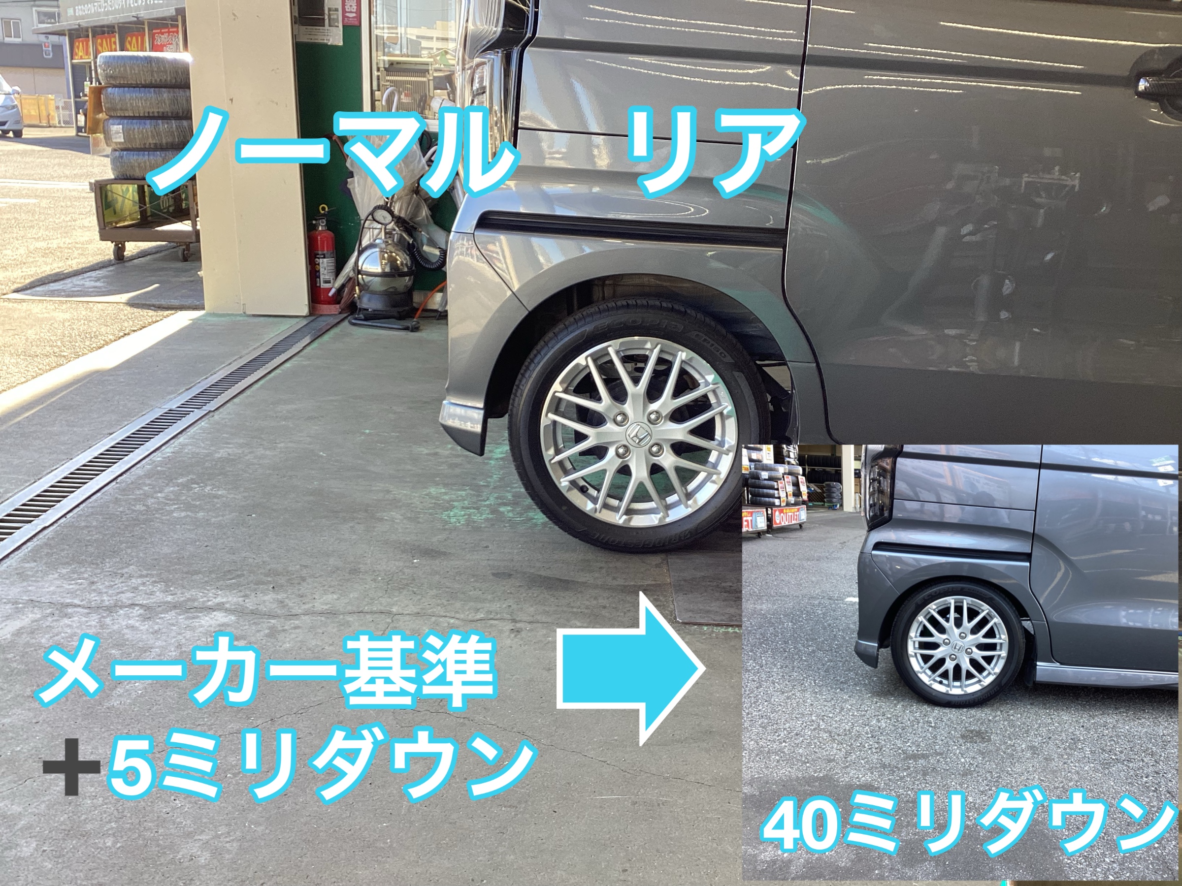 状態に調整取り付けしました。写真比べて下さい。タイヤ館八千代では足回りからパーツ取り付け純正