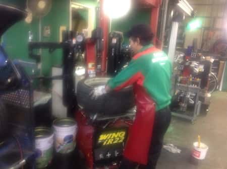 本日もお客様の、注文のタイヤ組み換えを閉店後に佐藤君が一生懸命作業しています。
