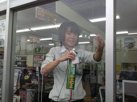 これから新しいPOPを設置するのに残ったテープ跡など綺麗にしてくれています。
