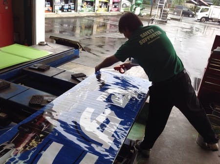 タイヤ館ではスタッフが日々手作業で貼ったり付けたり頑張っています。