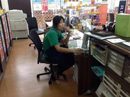 当店の女性スタッフはるちゃんお店作りプリントをパウチしている、