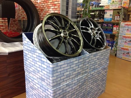 当店のホイールコーナー、あまり置く場所がないので臨時に作成中です。