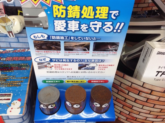 車の下廻り点検無料にて実施致します。マフラーや鉄の部分が錆びている車が