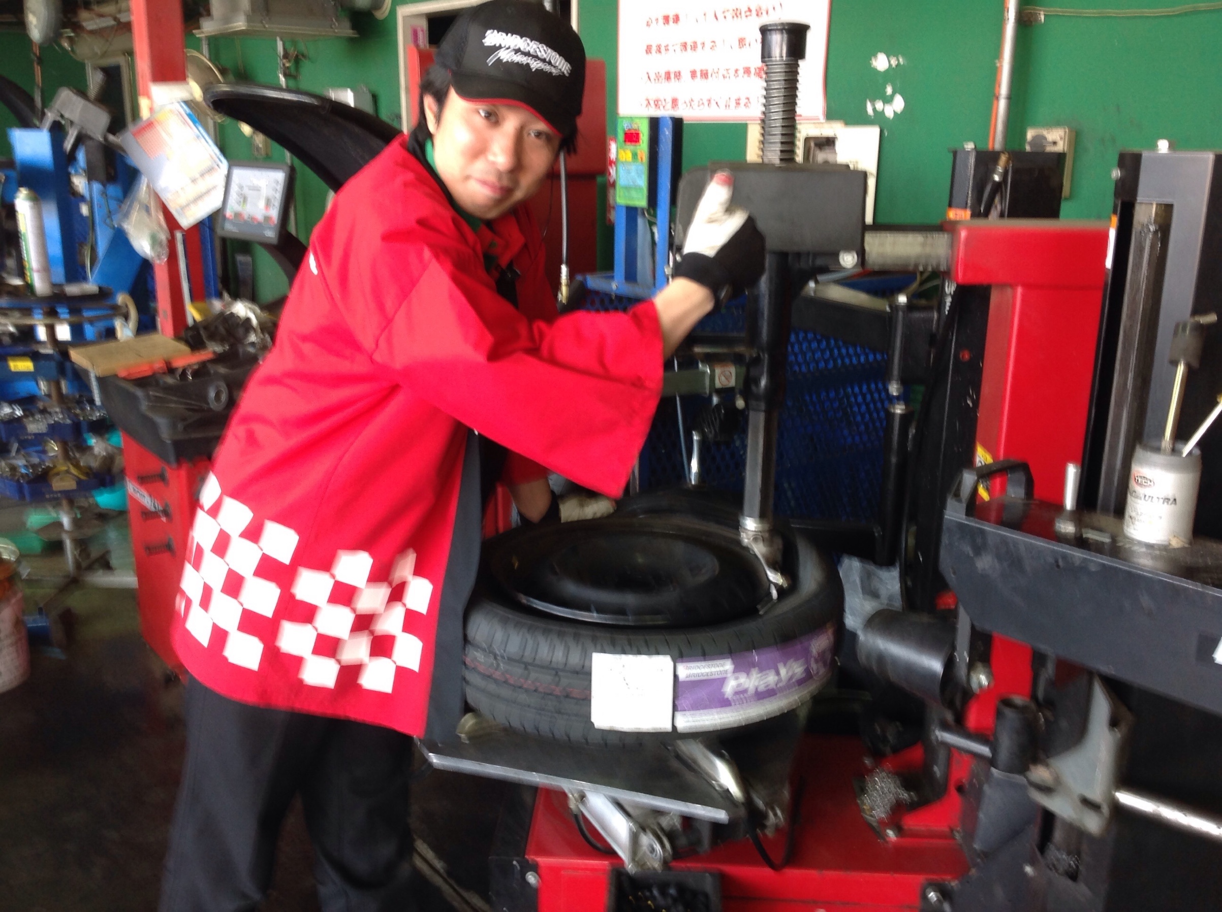 店長いい顔でタイヤ交換しています、交換しているタイヤはプレイズPXーCタイヤを