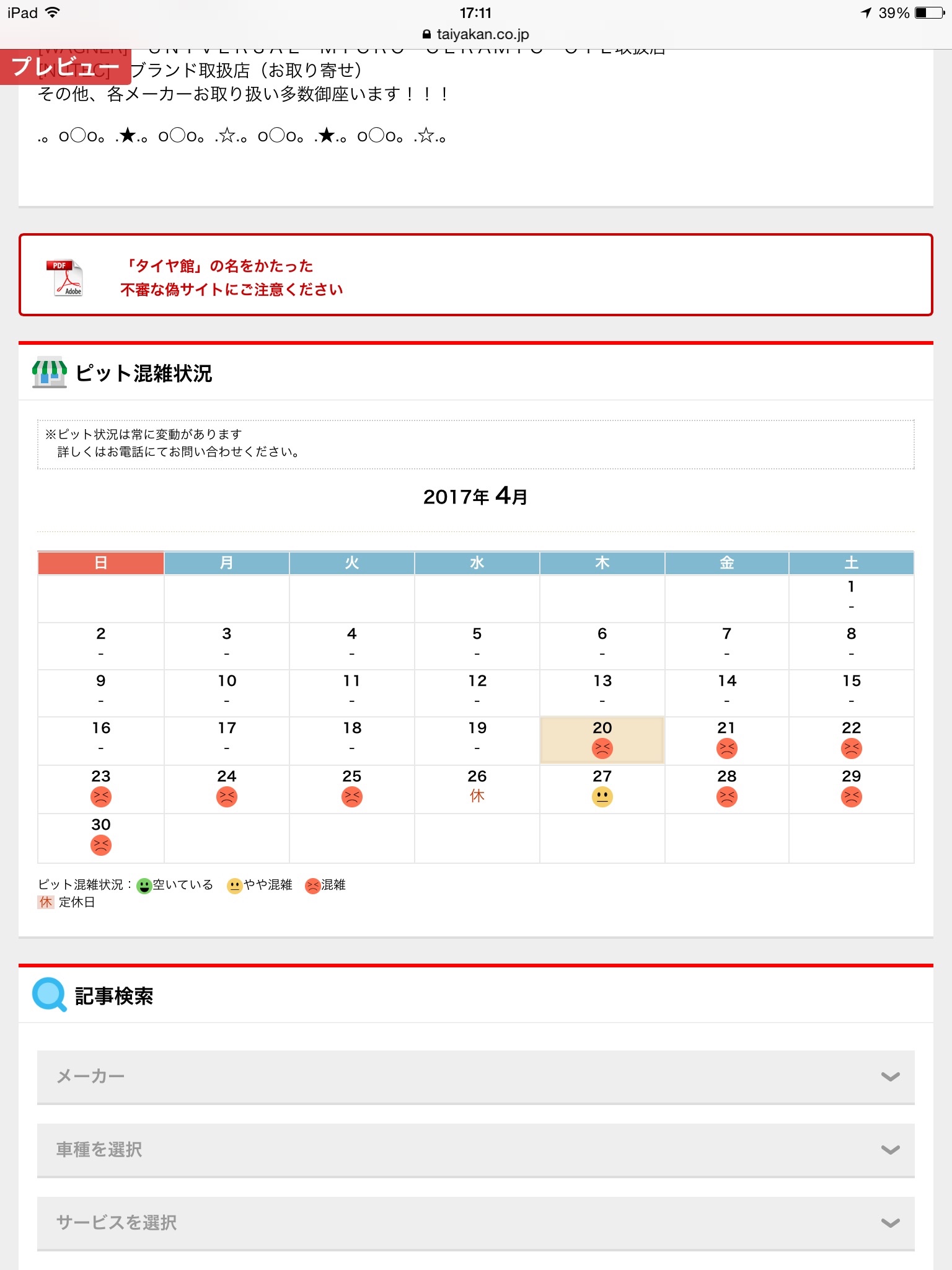 タイヤ館のHPから、ピットの混雑状況がチェックできるようになりました(^-^)