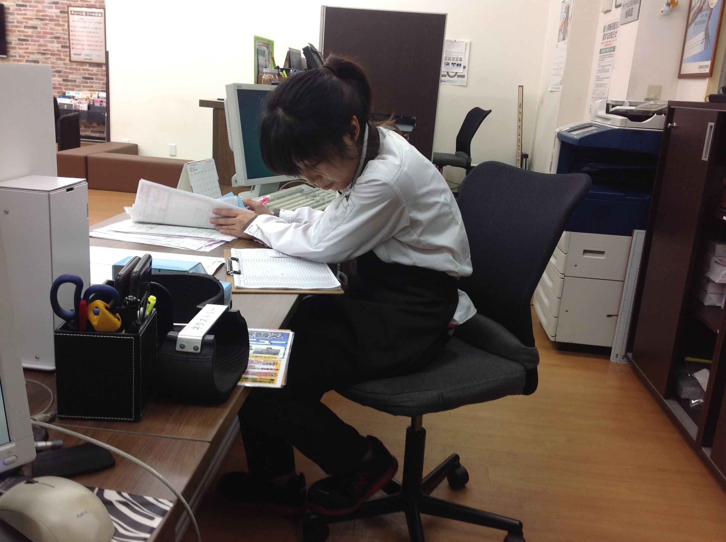 本日仕事終了後の伝票整理中の加瀬さんです。疲れていますな。