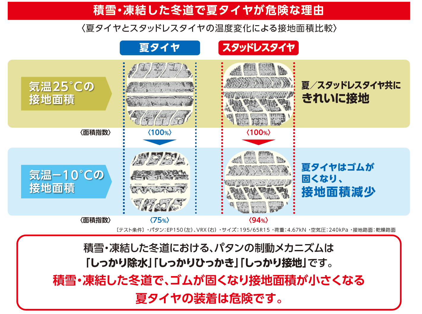 積雪・凍結した冬道でしっかり止まるためには「しっかり除水」「しっかりひっかき」「しっかり接地」の3つです。