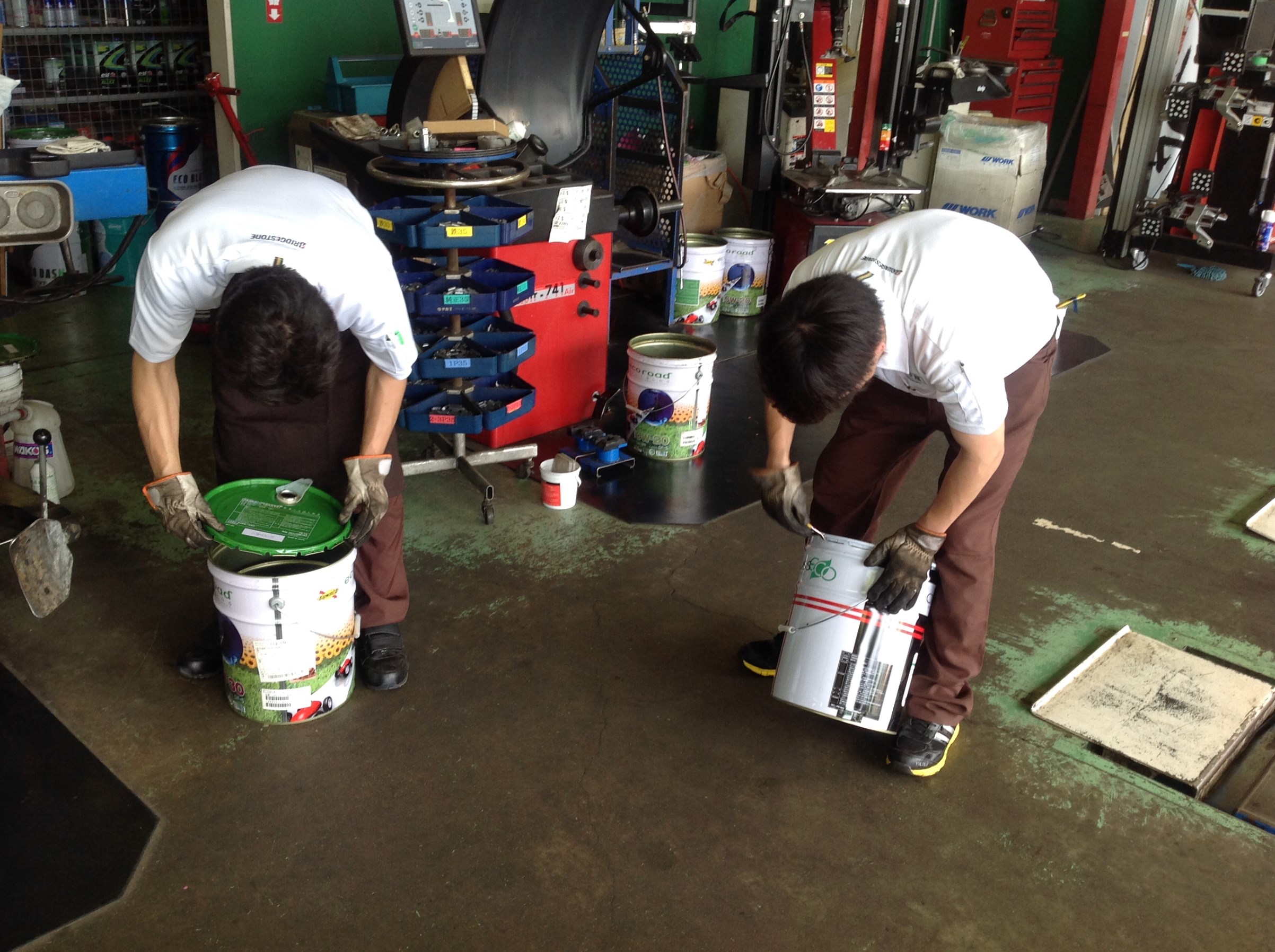 空になったオイル缶をばらしてお片づけしてくれてます。