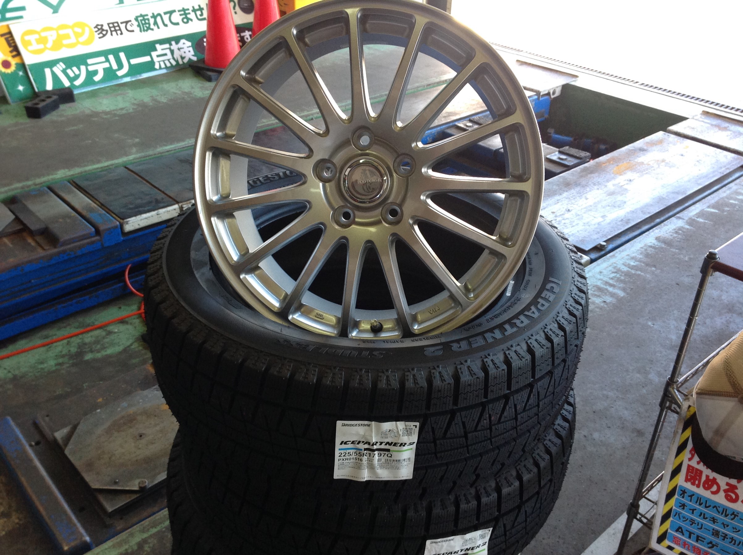 今日はスタッドレスタイヤとアルミホイールのセット取り付けです。
