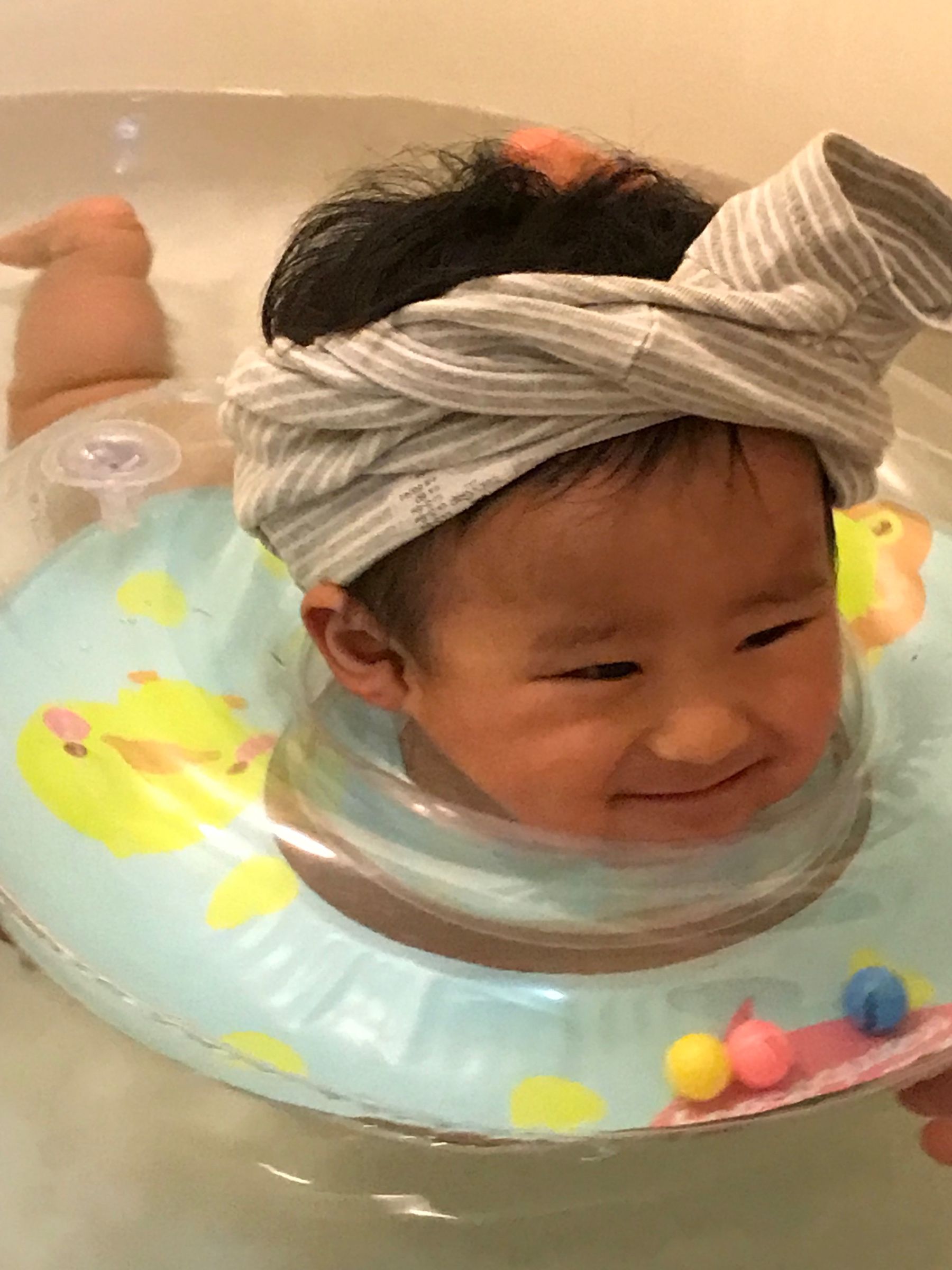 まだハイハイもできないので、自分で動ける唯一のお風呂です。