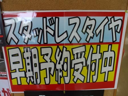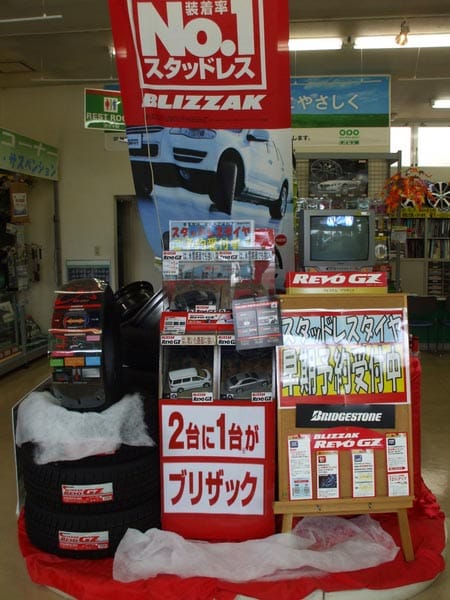 店内に早くもスタッドレスを展示しちゃいました。まだ夏なのにッ?