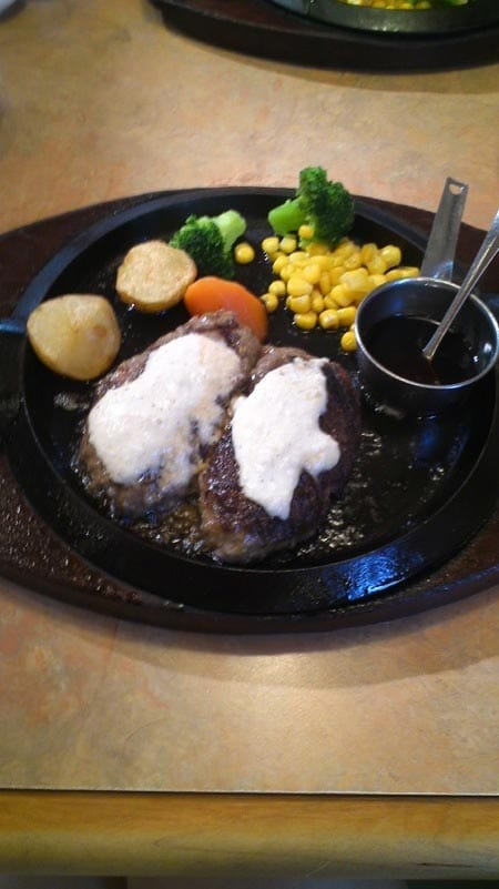 このハンバーグがですね、店員さんが焼きたてを半分に切ってミディアムで、