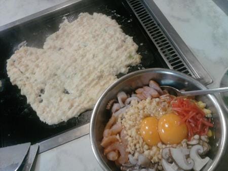 鉄板で焼いているのはもんじゃ焼きです★いろが白っぽいのがこちらのお店の