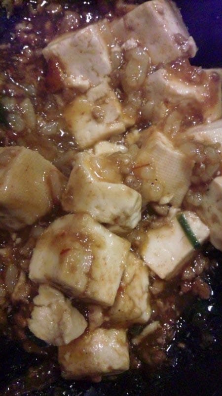 マーボー豆腐は釜に入っていて沸騰していました。お焦げを作るためだと思われます!!