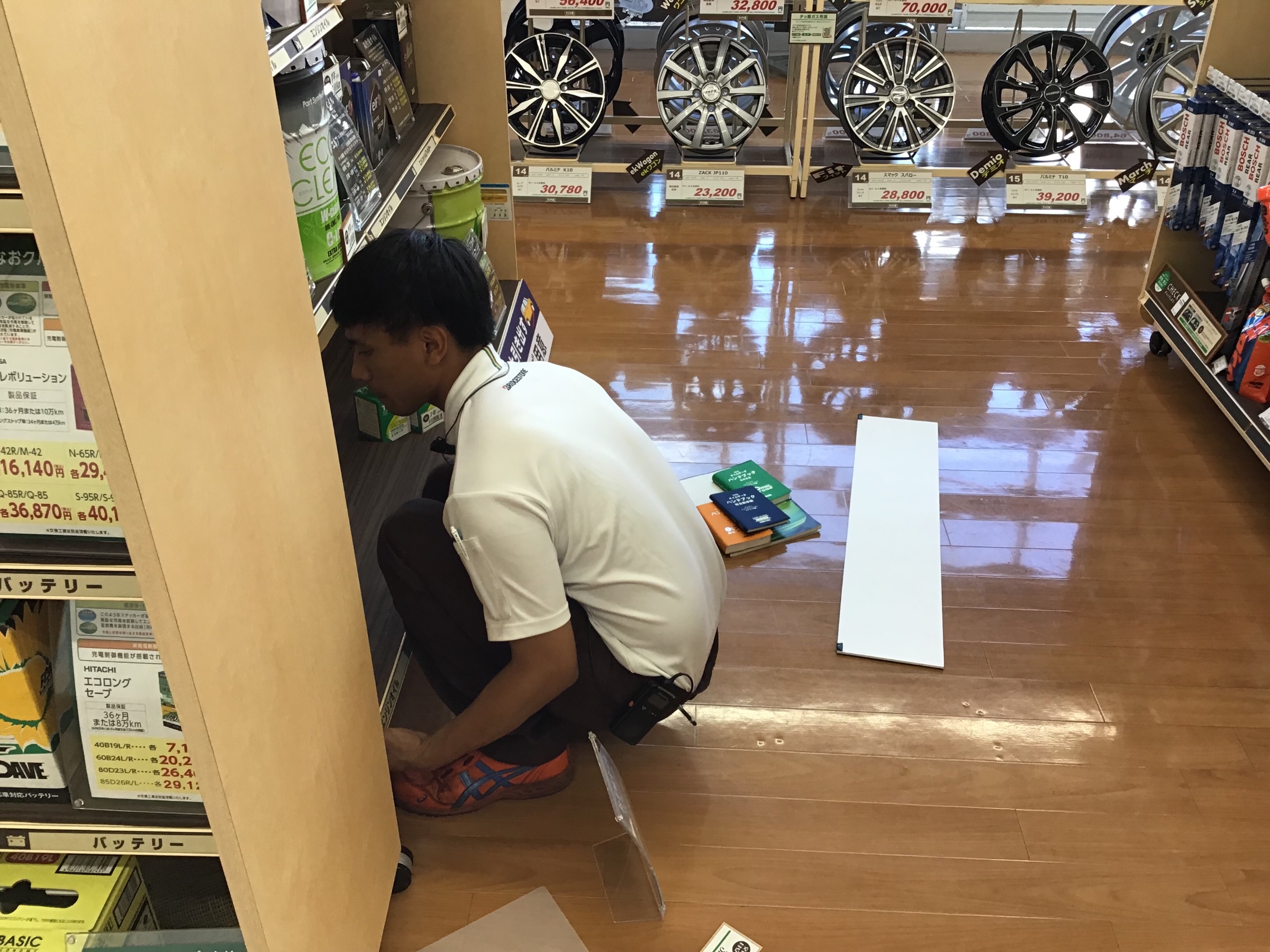 タイヤ交換作業の合間にオイル売り場のメンテナンスです。