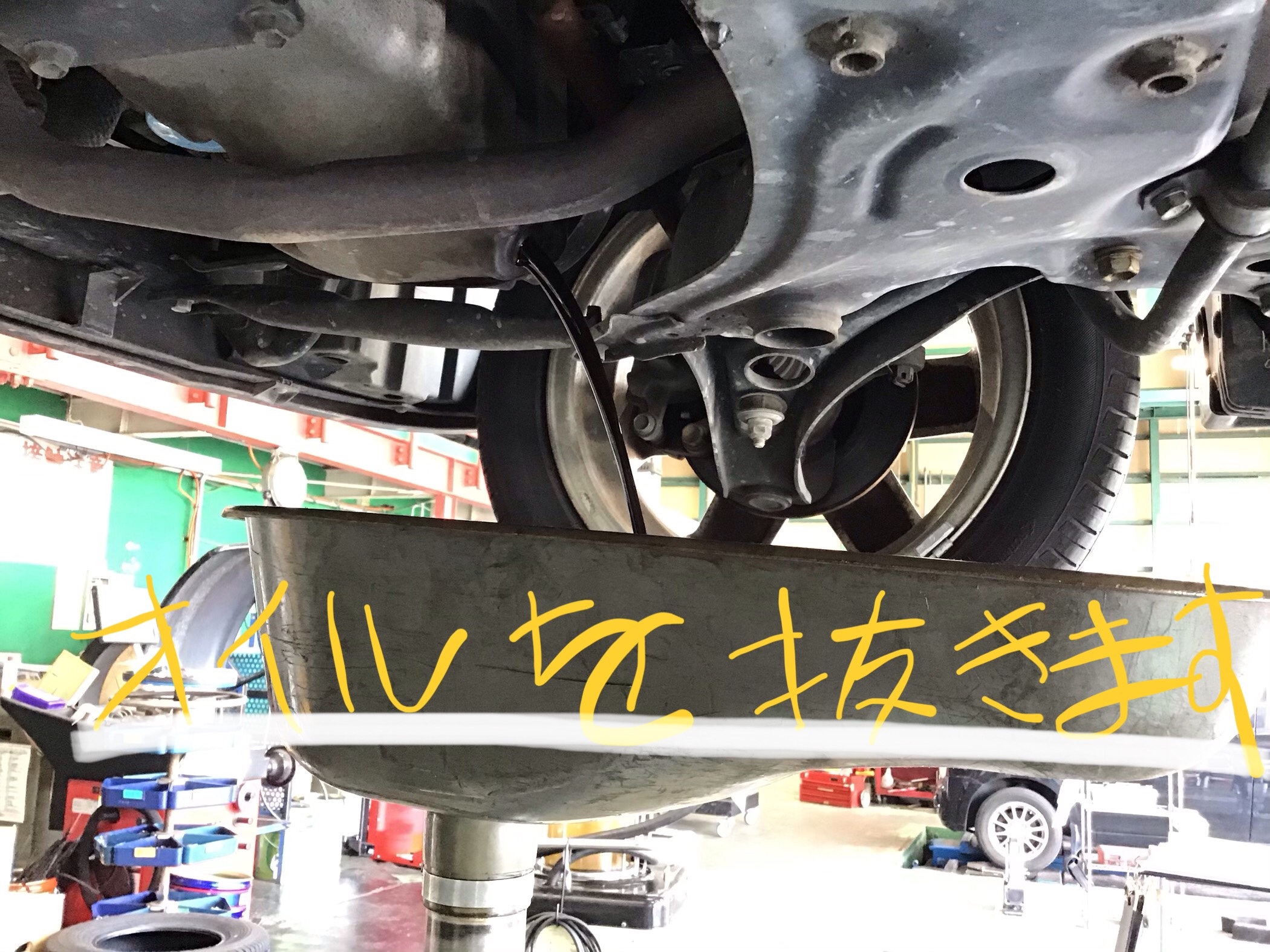 お車を持ち上げた状態で、下からオイルを抜きます。