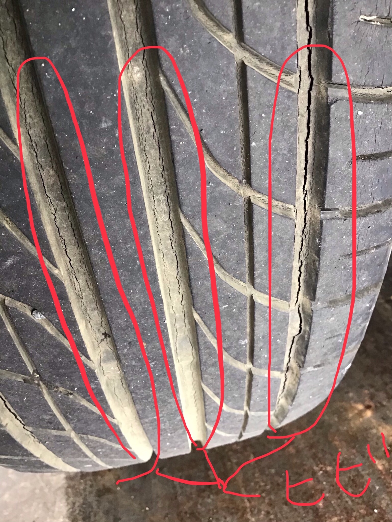 このヒビから雨水などが侵入し、タイヤ内部の鉄製の骨格を錆びさせ、骨格とトレッドゴムの剥離を引き起こします。