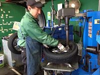 予約のお客様のタイヤを組んでる金内店長(^-^) 初売りセール大盛況です!!!