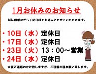 皆様、こんにちは(*^^)v 当店定休日のご案内です。 1月10日(水)・17日(水)・24日(水)は、定休日となります。 また、1月23日は、社内研修の為、13:00~の営業となります。 ご利用のお客様に置かれまして、ご迷惑おかけいたしますが、 何卒ご理解ご了承の程お願い申し上げます。