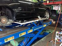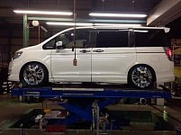 ステップワゴンのアライメント風景です。 ホイールが大きいですね♪ ステップワゴンはフロントのトウ調整です。 今回は振動も気になるという事で、 アライメントと一緒にセンターフィットもしました。