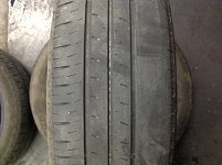 写真では解り難いかもしれませんが、 片方のタイヤだけ外側が異常磨耗をおこしています。 この症状はタイヤの向きがおかしいことで起きてしまっています。 タイヤの向きを正常にすることで接地面も変わりタイヤの性能もしっかり出せます。 こちらのお車はアライメント作業を行ない正しい向きに直し...