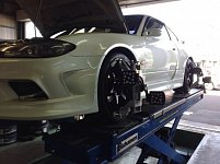 本日はS15シルビアのアライメント調整です。ワイドボディーに変更されていて エンジンルームを開けるとタコ足、タービンと・・・・デフもバキバキっと やる気なお車で、カッコ良いですね。お車も綺麗に仕上がっていました。 最近少なくなってきましたね、・・・・・・。やる気なお車・・・・・。
