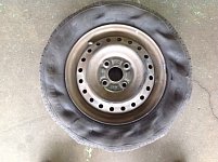 パンクの軽自動車が来店しました。 タイヤの形もグチャグチャになっています。 バラしてみます。 やっぱりタイヤが引きずってしまいボロボロです。 こうなってしまうと修理もできないので交換になります。