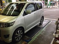 今日の軽自動車はワゴンRスティングレーです。 最近の軽自動車はホイールが大きいです。 ワゴンRスティングレーは15インチでした。 タイヤ交換とアライメント調整をしました。