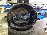 経年劣化もほどほどにしないとこうなります>< 「まだ使える!」は考えたほうがいいかもしれません(泣) タイヤが分離して、哀れな姿に・・・ もうタイヤの原型留めてないですね。。。