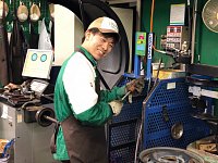 タイヤ交換中のともを撮ってみました! 珍しくカメラに反応せずに黙々と作業してます! これは古いタイヤをはがして、新しいタイヤを組む前に行う、リム清掃をしているところです! タイヤ館こだわりの作業の一つです。