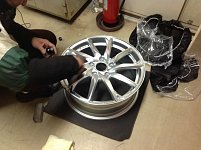 親方・中越さんが新品ホイールにガラスコーティング剤 【 anyany 】 塗りこみ中です! 高速すぎて手元が見えません!! コーティングすると薄ーい膜のようなものができて 光沢・艶が長持ち、汚れやキズがらホイールを守るすごいやつです(*^^)v