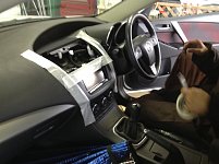 「ごしさん」当店の中越親分が車内でなにやら楽しそう。 ※顔出しNGといわれましたが、スタッフ紹介にしっかり載ってます^0^ カーナビの作業でしょうか、傷がつかないようにペタペタと保護中。 これで作業準備は整いました! 今回は、外す工具が届くのを待って、ここで終了。 (盗難防止の特殊な...