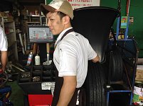 エンジンオイル交換を教えている狩野先輩。(奥) 勉強中の本多さん。(手前) オイル交換は狩野先輩にお任せください!