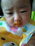 離乳食始めました。かぼちゃさんです。 美味しくないのかな? 険しい顔をしております。