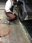 顔は写っていませんが、ベテランのごしさんが作業中です。 使用する工具も普通車の物と違いますね。 タイヤも工具も車もビッグサイズですね( ゚Д゚)