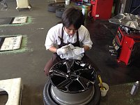 ピカピカのホイールにおどおどしてます。 カーディーラーさんからの依頼でタイヤの組み込み作業してます。 トヨタのクラウンのホイールでしょうかね? すごく高そうな輝きです。 アルバイトのニャット君もビビりまくりです(;_;)