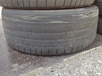 こちらのタイヤの減り具合、おかしいですね。 内側が外側(上が内側、下が外側)よりも摩耗が進んで、ワイヤー(タイヤの骨格)が露出しています。 これはアライメント不良によるもので、過度のネガティブキャンバもしくはトーアウトになっているとこういった現象が現れます。 しかし、タイヤの内側...