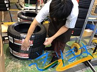 他店にタイヤを送ります! 忙しい中に中澤さんは一所懸命タイヤの送り準備をしています。
