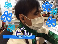 店長にカメラを向けるとなぜかこのポーズ!? 小顔のポーズみたいですよ♪( ´▽`) 小顔に見せたい方は手を顔の前に出しましょう(笑)