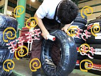 中川さんがタイヤにラップを巻いています。 何本目でしょう。 カメラの方向いてくれなかったです(つД`)ノ